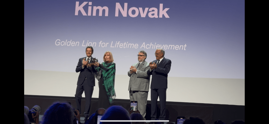 Quest’anno ho avuto la possibilità di vedere una delle ultime icone del cinema hollywoodiano degli Anni Cinquanta/Sessanta per la consegna del Leone d’oro alla carriera all’attrice statunitense Kim Novak protagonista di titoli famosi come Pic nic (1955) di Joshua Logan, The Man with the Golden Arm (L’ uomo dal braccio d’ oro, 1955) di Otto Preminger ma soprattutto passata alla storia del cinema con Vertigo (La donna che visse due volte, 1958) di Alfred Hitchcock.